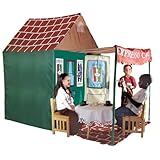 Kids will enter a world of imagination as they pretend to enjoy tea and snacks at a cozy little patio cafe. Adorned with a striped awning, a roll-out "brick" patio, and a front entrance with a swinging door and roll-up window, Le Cafe offers a quaint, charming setting for little diners. Furniture and aprons not included. Shock-corded PVC poles and a polyester cover make for easy set-up and storage. Playhouse measures 7' x 4'; holds up to eight children. Adult assembly required.